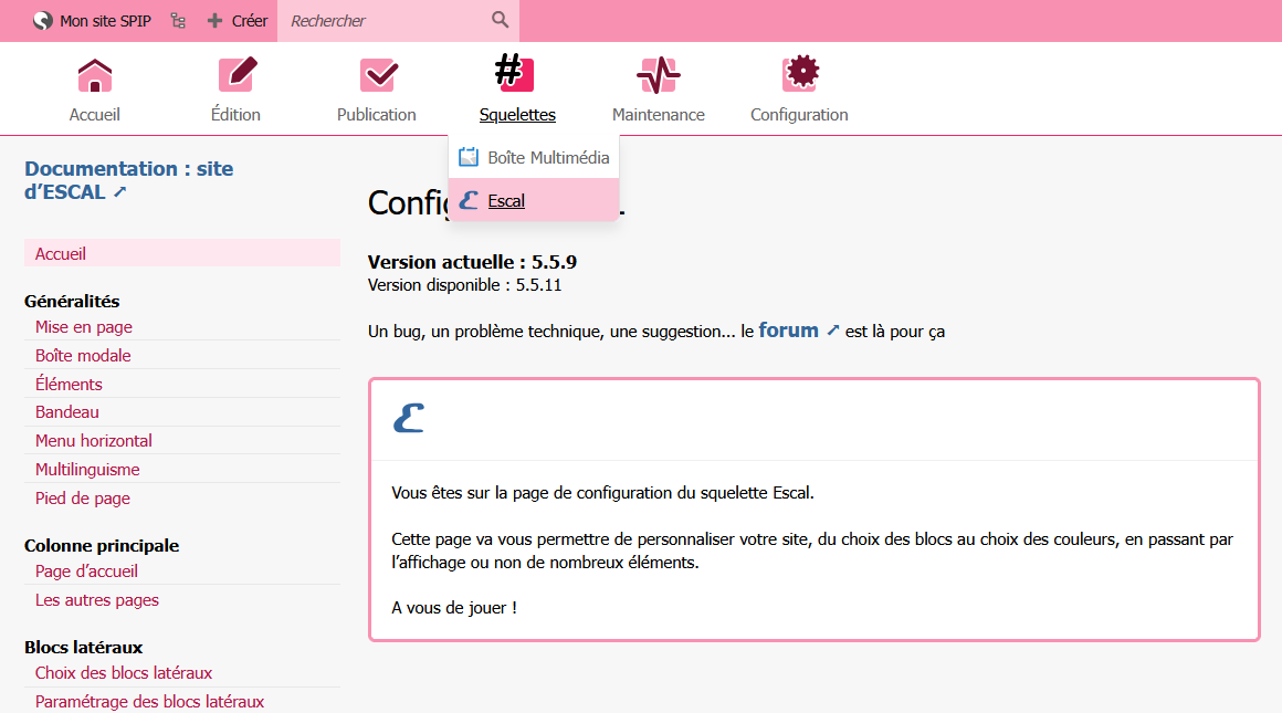 C’est l’ensemble des pages accessibles à tout visiteur. Il s’agit de l’affichage des articles, brèves, rubriques que vous avez publiés, ainsi que des interventions dans les forums qui y sont associés. Il est généré par les fichiers « squelettes ».