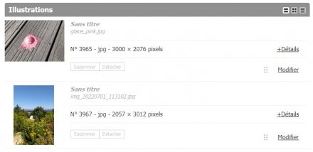Ce sont les images filtrées par le critère vu. On ne peut pas supprimer ou détacher ces images. Il faudra donc au préalable supprimer les codes <docXX> correspondants dans le texte de l’article.